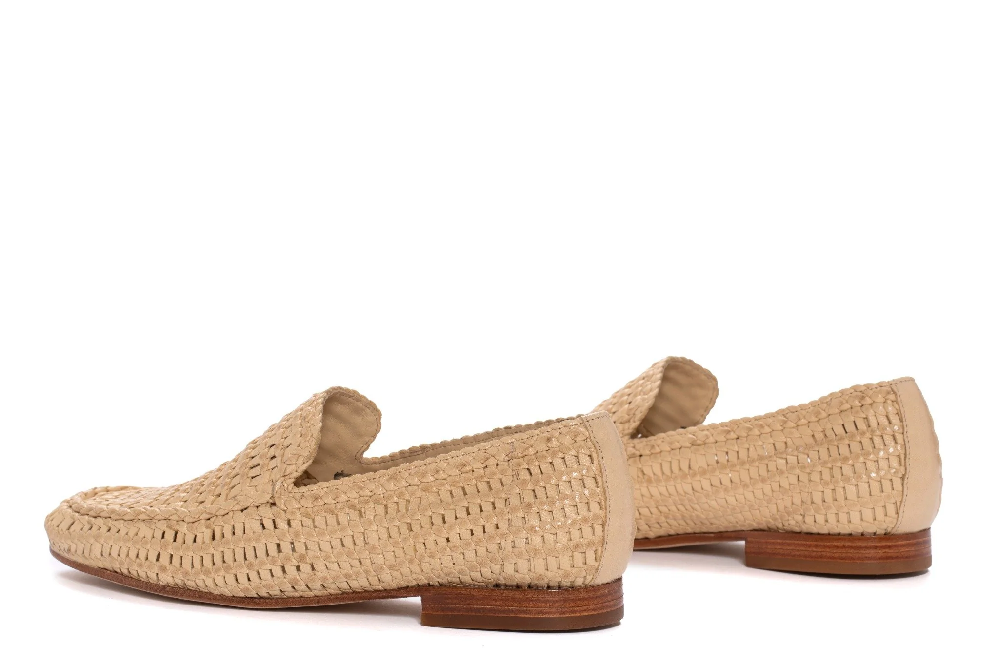 Estos mocasines en un elegante tono beige destacan por su confección artesanal con piel trenzada a mano. Su diseño versátil permite combinarlos tanto en looks casuales como más formales.