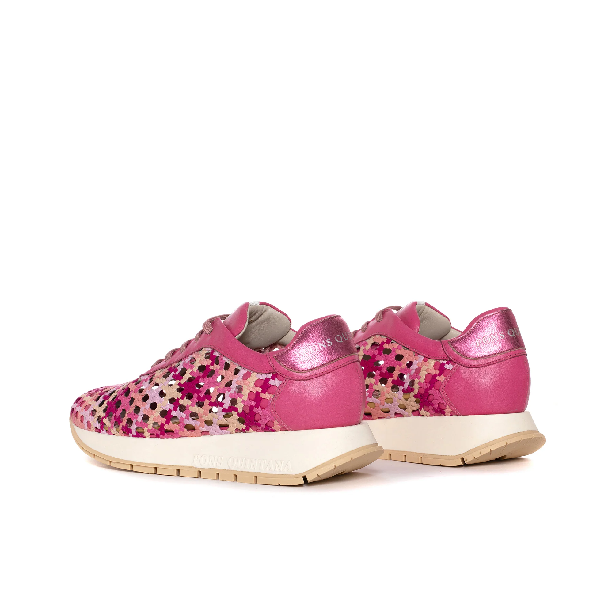Deportiva MANDY confeccionada en piel wet trenzada a mano color fresa en combinación con wet milk, nude y malva. Cierre mediante cordones a tono. Suela de goma antideslizante. Plantilla ortopédica extraíble. Altura de 3 cm. PONS QUINTANA