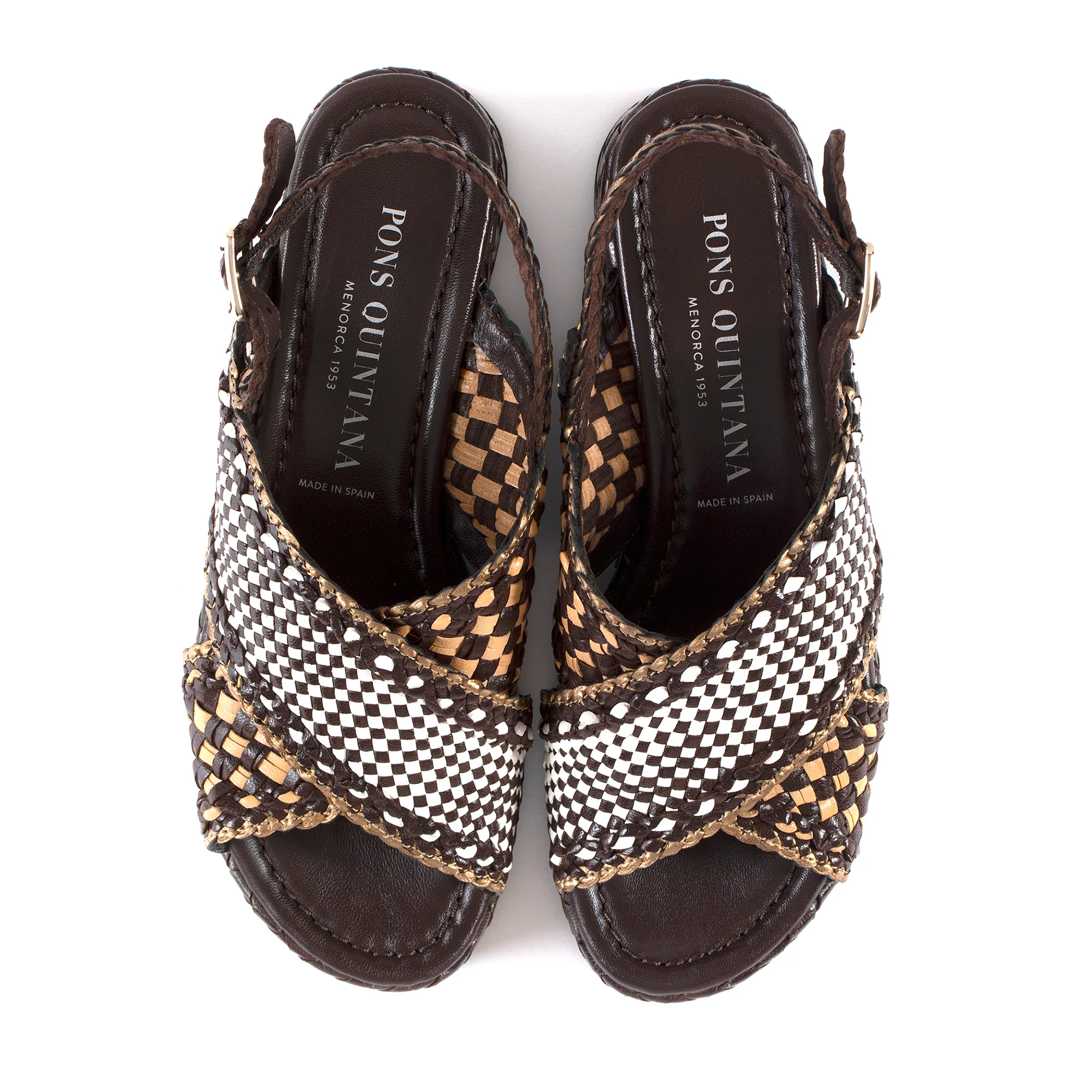 Sandalia de plataforma FORLI en piel trenzada a mano color café en combinaciones de otros colores naturales. Plataforma forrada de piel trenzada a tono. Piso de goma antideslizante. Altura delantera 3,5 cm y trasera 4,5 cm. PONS QUINTANA
