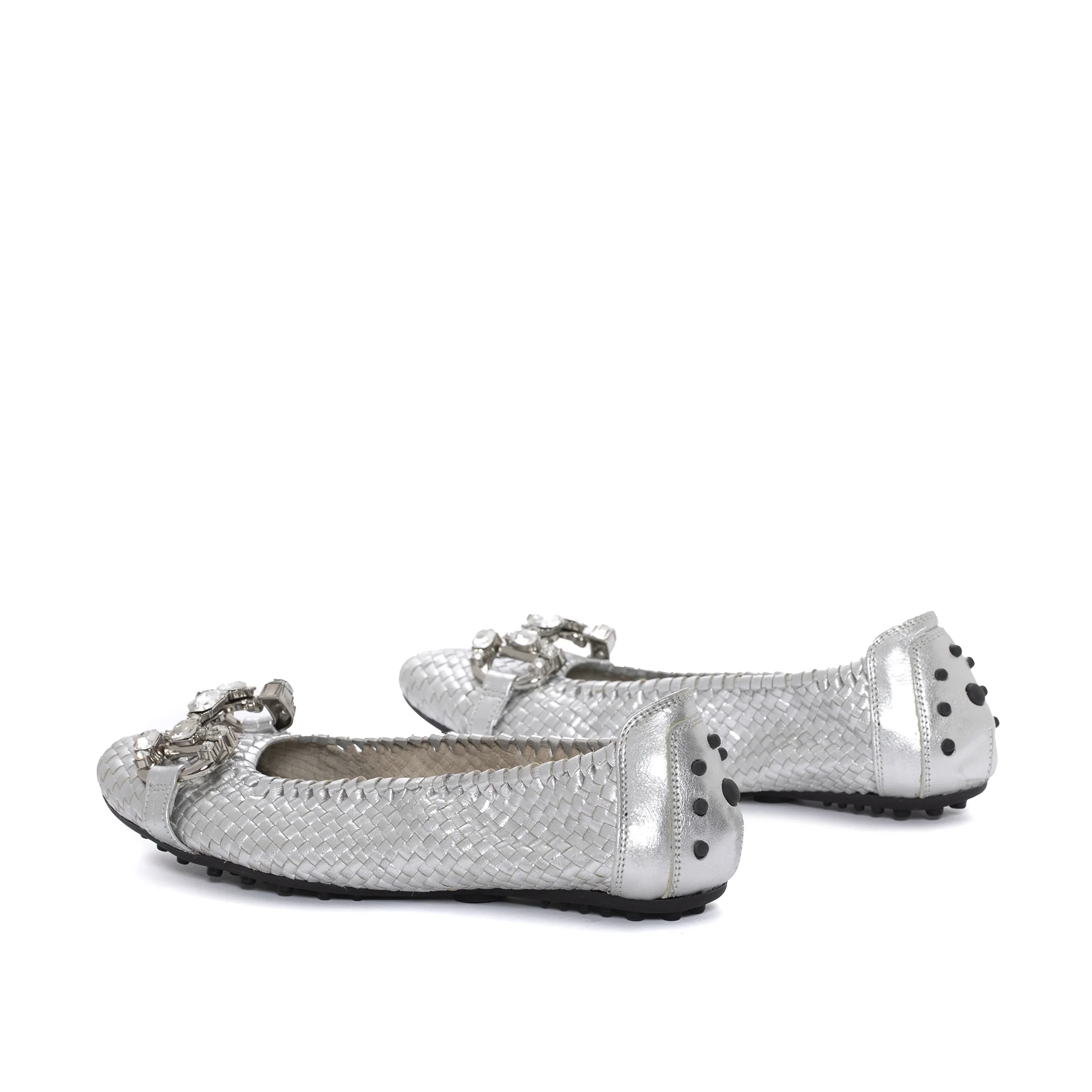 Bailarina PILAR realizada en piel trenzada a mano color metal silver. Elástico para un mayor ajuste al pie. Adorno en la parte superior. Detalle de bolinos en el talón. Suela de piel. Altura de 1 cm. PONS QUINTANA