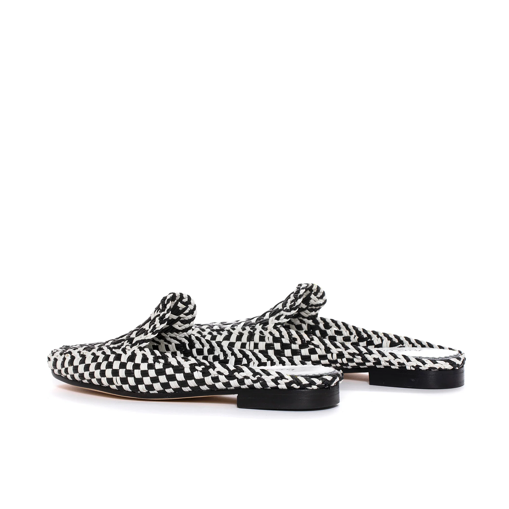 Mule BARI en piel wet trenzada a mano color blanco y negro. Acabado en punta redonda. Suela de piel. Altura de 1 cm. La piel wet es mucho más suave ya que es libre de cromo y cuenta con una curtición natural sin manchas de hierro, lo que ayuda a disminuir notablemente el impacto en el medioambiente. PONS QUINTANA