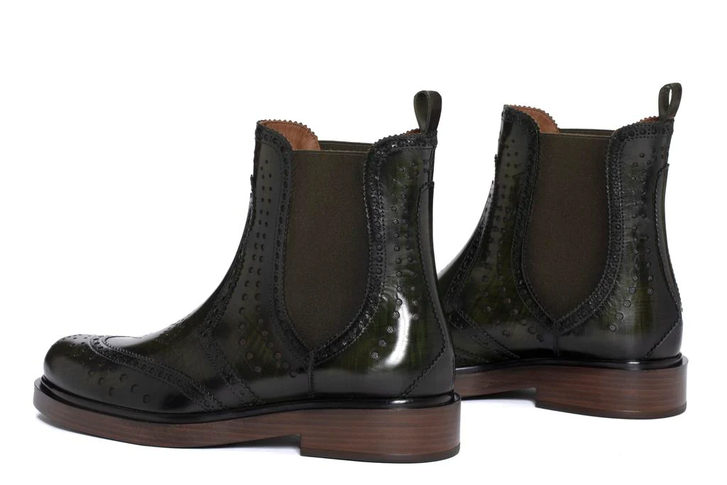 Botín plano tipo Chealse Seline confeccionado en piel nepal color musgo. Acabado en punta semi redonda con diseño perforado sobre empeine y caña. Elástico lateral. Tira trasera para facilitar el calce. Suela de goma antideslizante. Altura tacón 3,5 cm, altura delantera 2,5 cm.