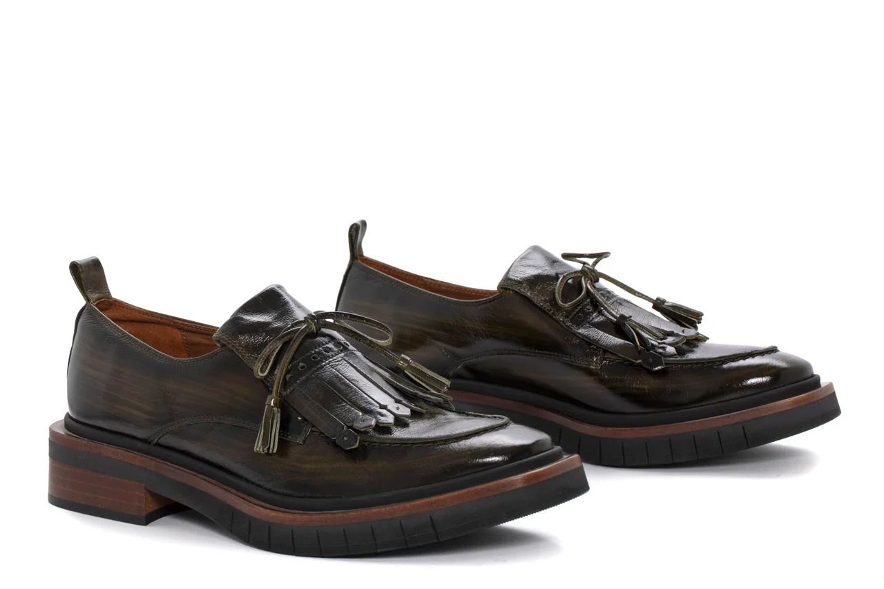 Mocasín de plataforma Petra confeccionado en piel branch color bosque. Acabado en punta cuadrada. Detalle de borlas y flecos sobre empeine. Tira trasera para facilitar el calce. Vira de piel a tono. Piso combinado de efecto madera y micro-negro.