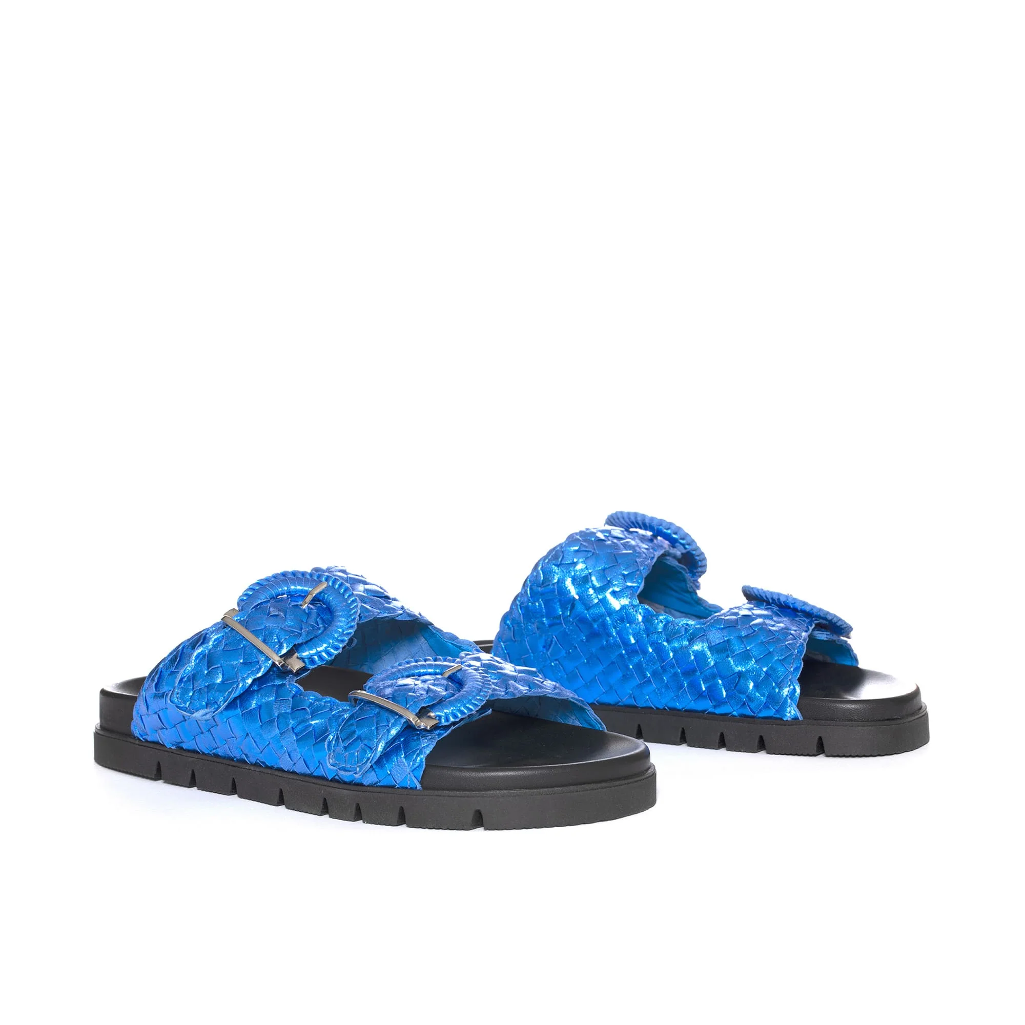 Sandalia plana CAIMAN de estilo fusbet en piel trenzada a mano color metal tinta. Doble tira de piel con hebillas metálicas para un mayor ajuste. Piso ortopédico de goma. Altura de 3cm. PONS QUINTANA
