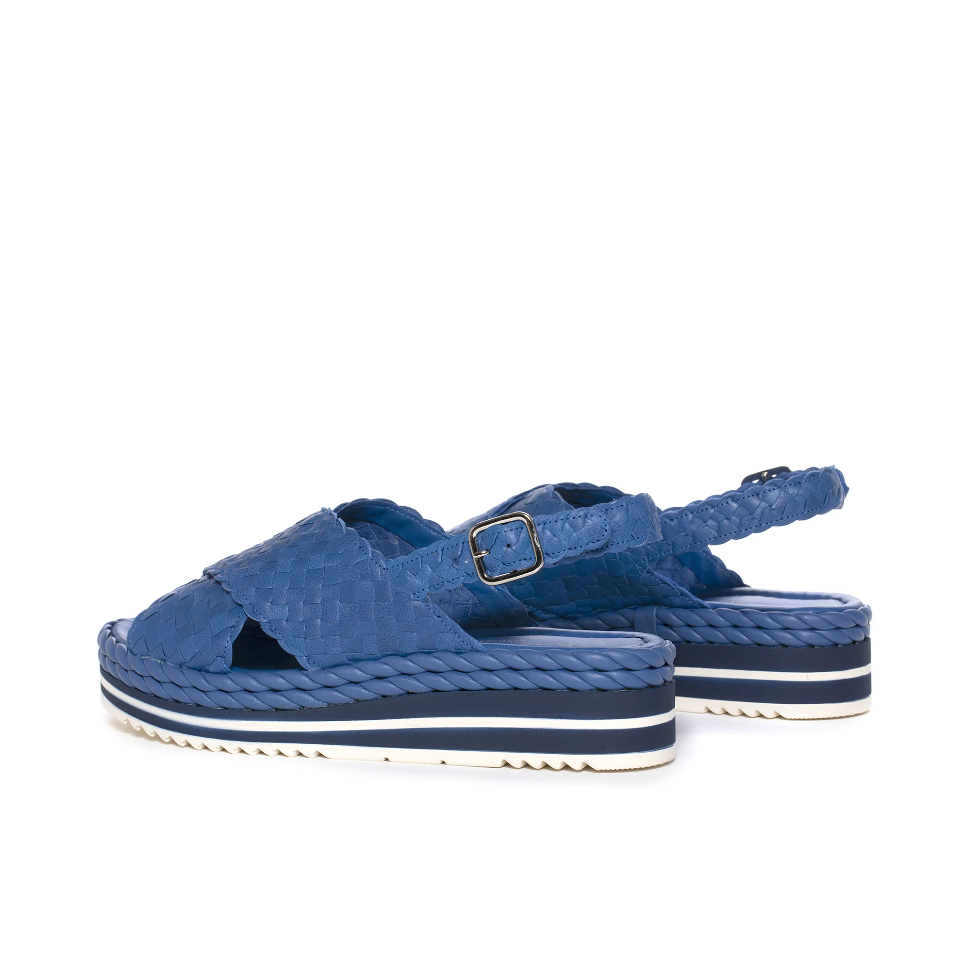 Sandalia de plataforma MILAN en piel wet trenzada a mano color jeans. Pala cruzada. Cierre mediante hebilla en el tobillo. Tubular alrededor de la plataforma con efecto cuerda a tono. Piso bicolor a tono. Suela de goma antideslizante. Altura delantera 3 cm y trasera 4,5 cm La piel wet es mucho más suave ya que es libre de cromo y cuenta con una curtición natural sin manchas de hierro, lo que ayuda a disminuir notablemente el impacto en el medioambiente. PONS QUINTANA