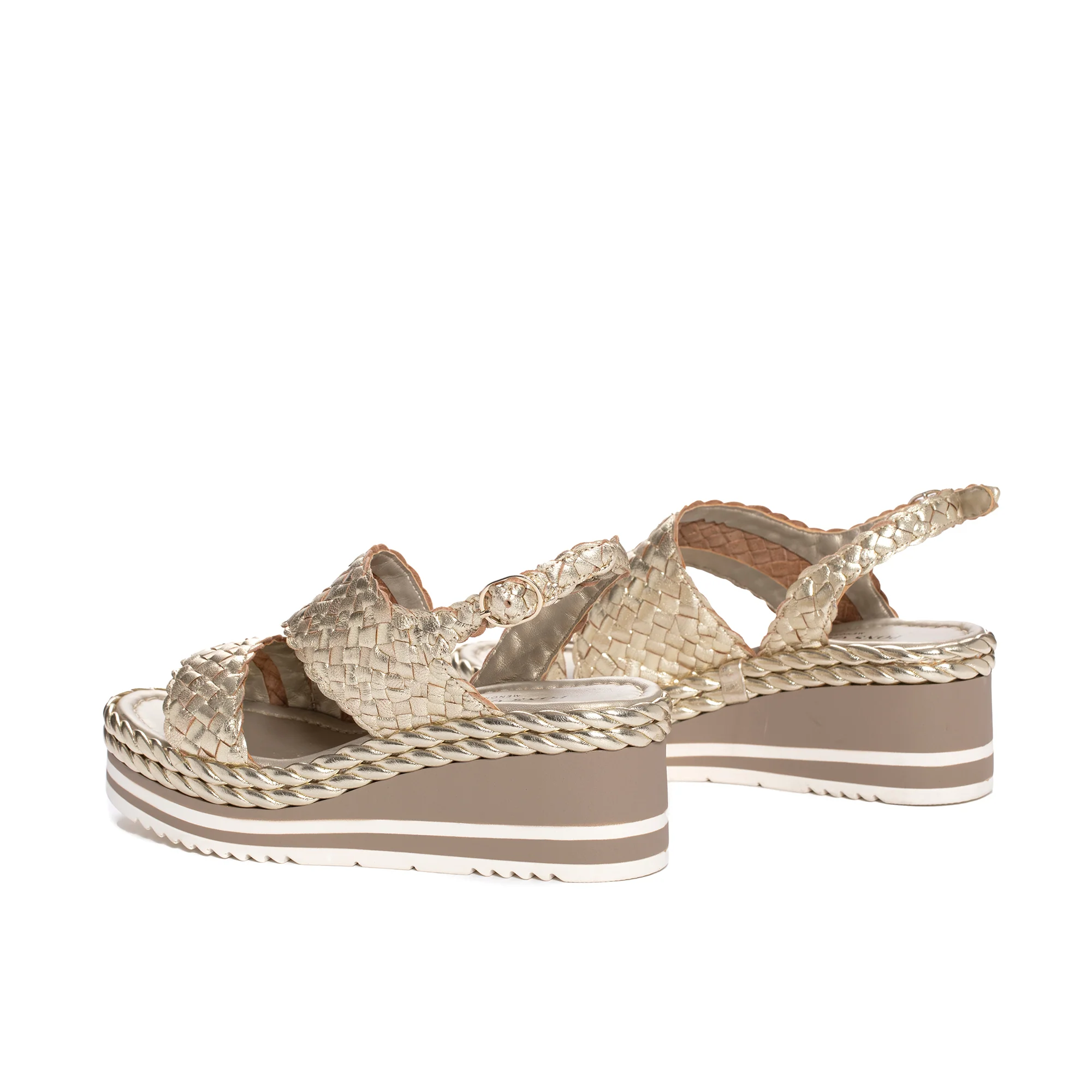 Sandalia de plataforma PADOVA en piel trenzada a mano color metal platino. Cierre mediante hebilla en el tobillo. Tubular de efecto cuerda alrededor de plataforma. Piso bicolor a tono. Suela de goma antideslizante. Altura delantera de 4 cm y trasera de 6,5 cm. PONS QUINTANA
