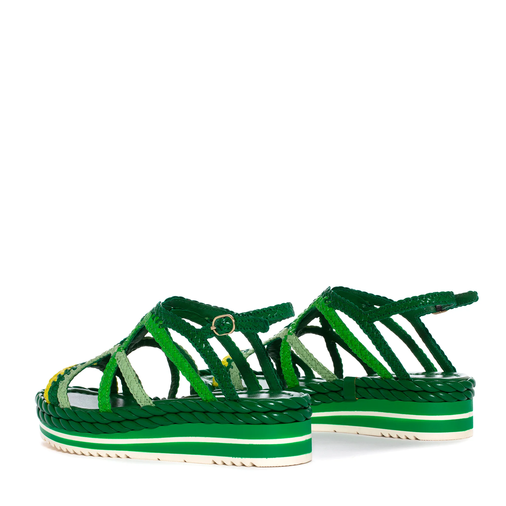 Sandalia de plataforma MILAN en piel wet trenzada a mano color multi verde. Cerco tubular a tono. Piso bicolor a tono. Suela de goma antideslizante. A ltura delantera 3 cm y trasera 4,5 cm. PONS QUINTANA