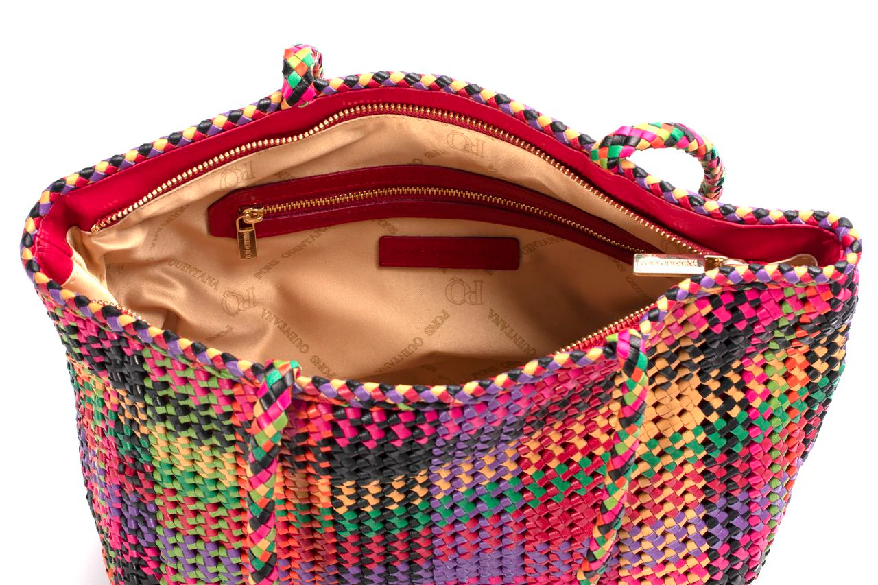 Bolso de hombro V077 confeccionado a mano en piel trenzada multicolor que aporta un toque único y vibrante. Asa a tono. Forro textíl. Detalle de chapa con el logo de la marca. Su diseño amplio y funcional, con cierre de cremallera y bolsillo interior, lo lo convierte en el aliado ideal para el día a día. Perfecto para realzar looks básicos y añadir personal personalidad a tus estilismos casuales y veraniegos.Unidades limitadas, no te quedes sin el tuyo!