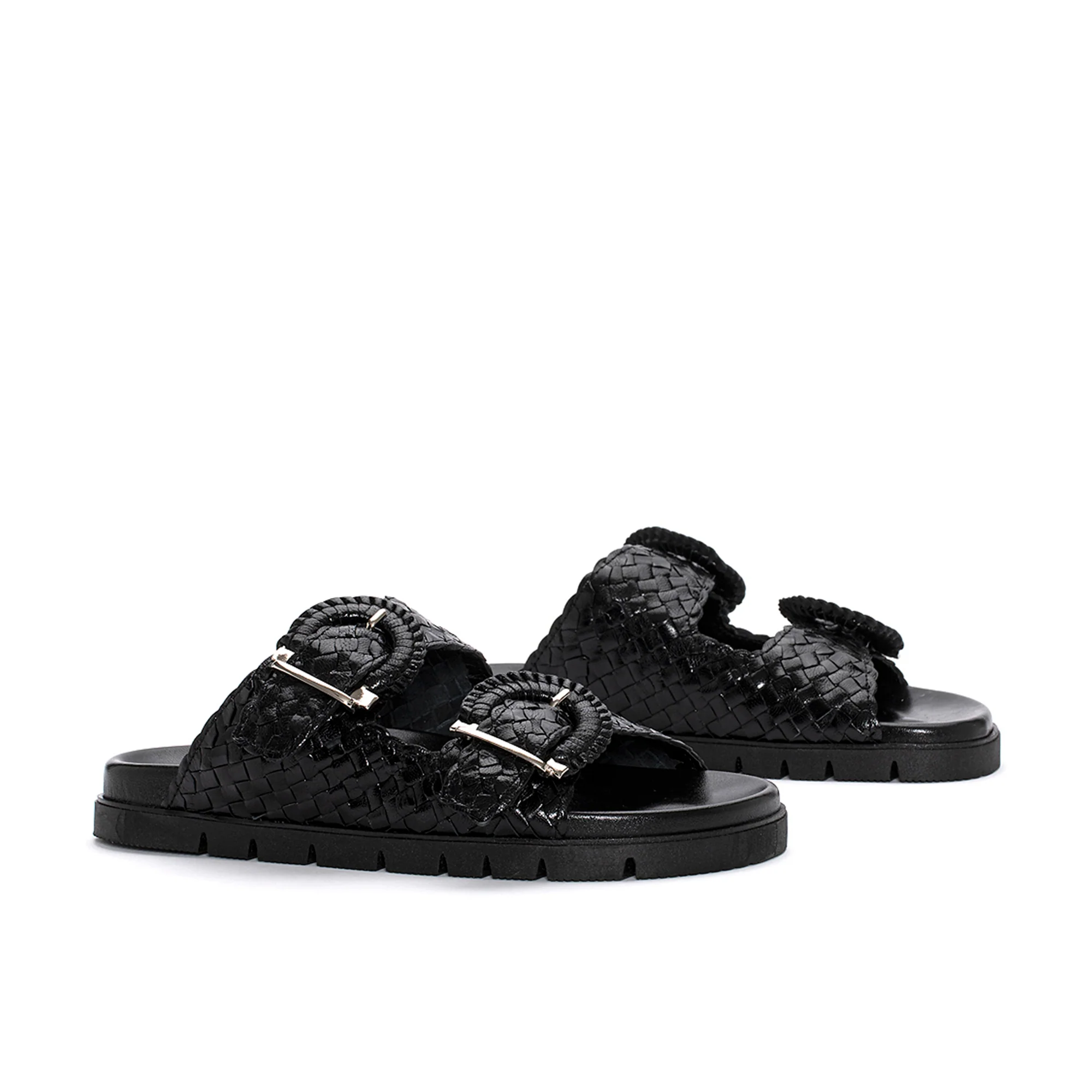 Sandalia plana fusbbett realizada en piel trenzada color negro. Hebillas para ajustar el calce. Piso ortopédico de goma. Altura de 3 cm. PONS QUINTANA