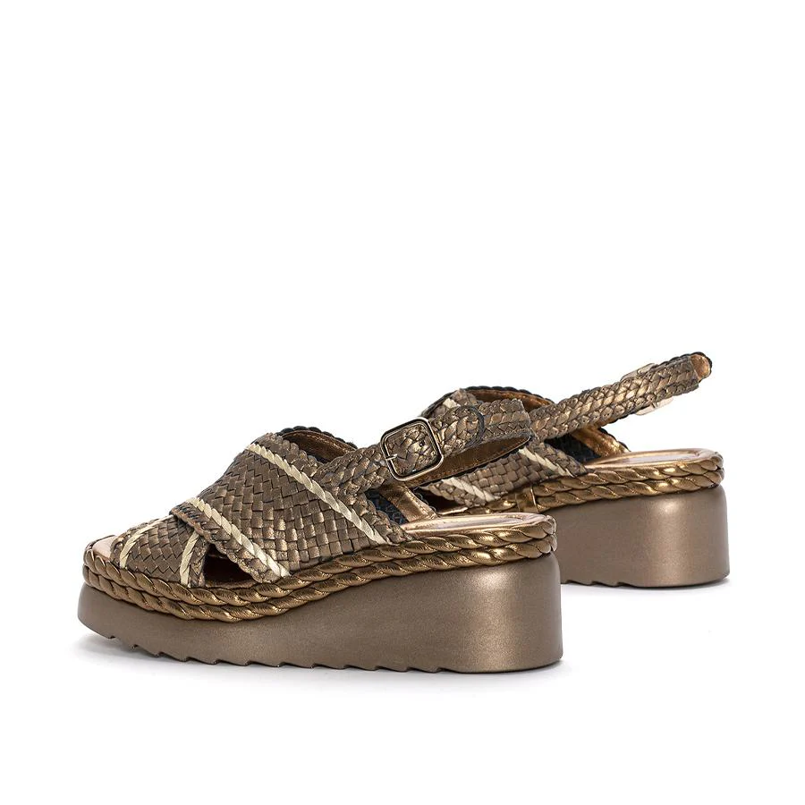 Sandalia de plataforma IBIZA confeccionada en piel trenzada a mano color cobre con combinación de otros colores. Cierre mediante hebilla en el tobillo. tubulares efecto cuerda a tono. Piso dentado a tono. Suela de goma antideslizante. Altura delantera de 3 cm y trasera de 7 cm.