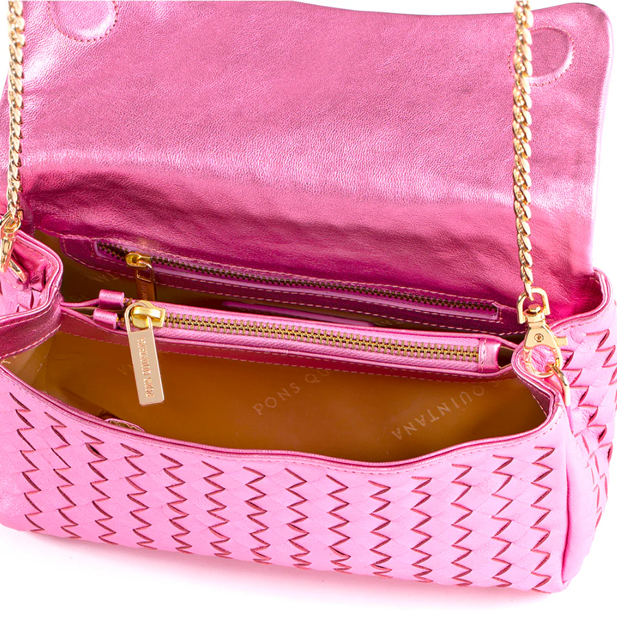 Bolso de mano confeccionado en piel wet trenzada a mano color metal malva. Forro textil. Bolsillos interiores con cremallera. Cadena extraíble. Cierre mediante imán. PONS QUINTANA