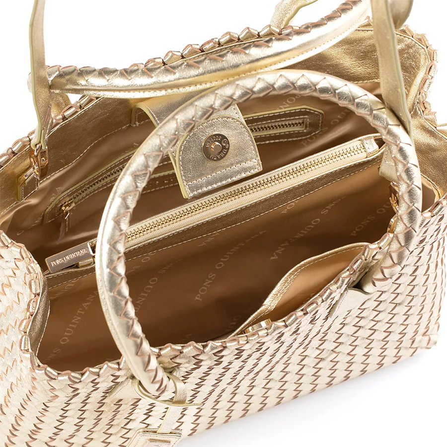 Bolso de mano confeccionado en piel trenzada a mano color metal platino. Forro textil. Diversos compartimentos interiores con cremallera. Cierre mediante imán. Asa fija y asa de piel extraíble y ajustable. PONS QUINTANA