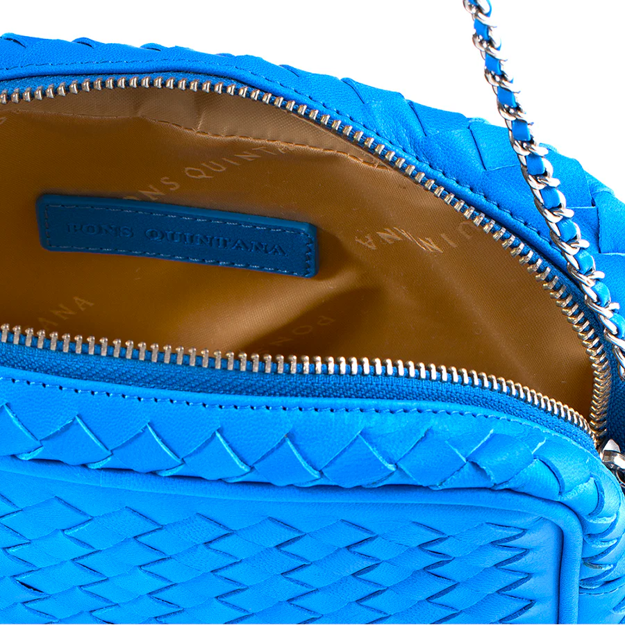 Bandolera confeccionada en piel wet trenzada a mano color cobalto. Forro textil. Cadena extraíble. Cierre mediante cremallera. PONS QUINTANA