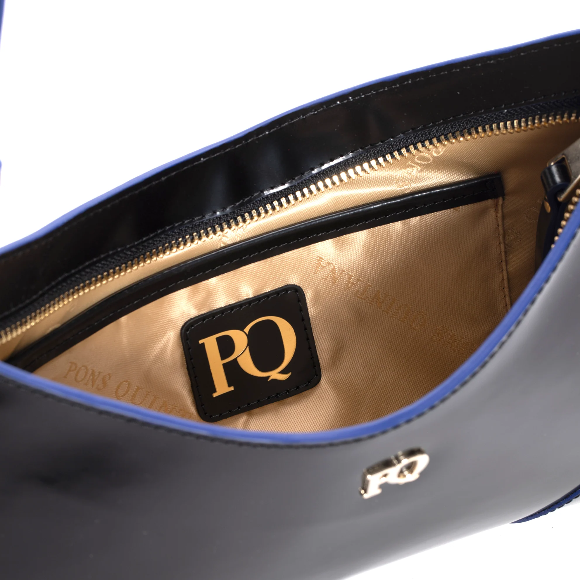 Bolso de mano confeccionado en piel spazzolato color negro con asa y costuras en color cobalto. Forro textil. Cierre mediante cremallera. Asa de piel. Medidas 27x135x3 cm. PONS QUINTANA