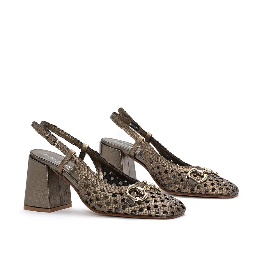 Zapato de tacón destalonado OSAKA confeccionado en piel trenzada a mano color metal cobre. Detalle de abalorio metálico en empeine. Acabado en punta cuadrada. Cierre mediante hebilla en el tobillo. Suela de cuero natural. Altura tacón 7,5 cm.
